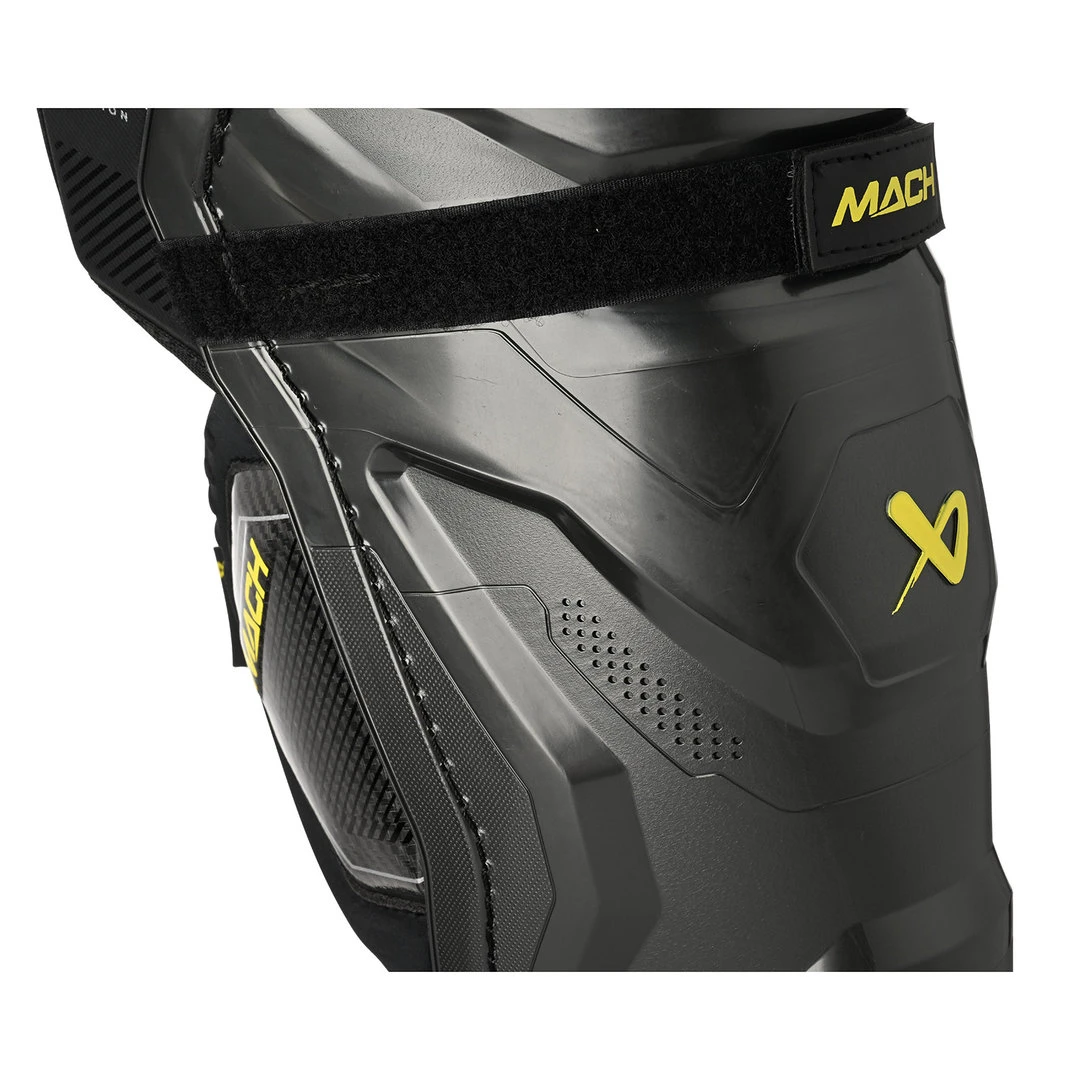 Der Bauer Supreme MACH Beinschutz bietet mit dem XFLEX Shield Schienbeinschutz und dem Curv Composite Wadenschutz optimalen Schutz vor Verletzungen. Das Gelenk ermöglicht einfache Schlittschuhschritte und sorgt für eine bessere Beweglichkeit auf dem Eis. Die ErgoDynamic Kniekappe sorgt für einen tieferen Sitz und schützt das Knie vor Verletzungen. Der Beinschutz ist flexibel und mit HD Schaum gepolstert, um auch hier optimalen Verletzungsvorbeugung zu bieten. Der komfortable Klettverschluss sorgt dafür, dass der Beinschutz sicher am Bein sitzt und nicht verrutscht. Das entfernbare Futter mit vorgeformtem Luftkanal sorgt für ein angenehmes Tragegefühl während des Spiels.