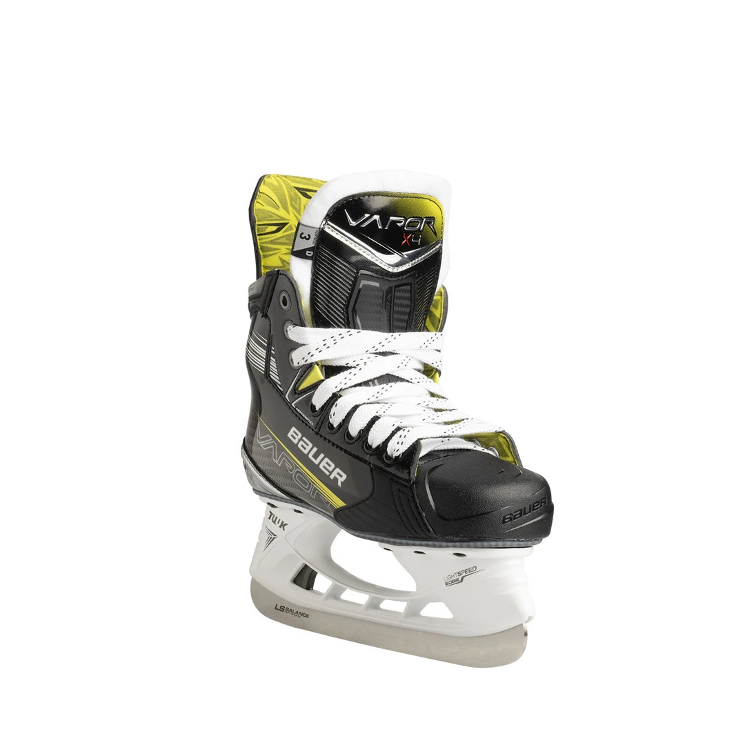 Der Bauer Vapor X4 Jr. ist der perfekte Eishockeyschlittschuh für junge Spieler, die ihre Fähigkeiten auf dem Eis verbessern möchten. Die flexible Sohle und das harte Top sorgen für eine optimale Kraftübertragung und Stabilität beim Skaten. Die 40-oz Youth Pro Stock Zunge bietet zusätzlichen Komfort und Schutz vor Schüssen und Schnitten. Der TUUK Lightspeed Edge Holder garantiert eine sichere Verbindung zwischen Kufe und Schlittschuh. Bei diesem Holder kann die Kufe mit nur einem Handgriff gewechselt werden. Die Außenhaut besteht aus Digi Composite Material und ist robust und strapazierfähig. Durch das Anaform upper passt er sich perfekt an den Fuß des Spielers an und bietet somit maximalen Komfort. Die LS Balanced Kufe besteht aus hochwertigem Edelstahl, der eine hervorragende Griffigkeit auf dem Eis gewährleistet und schnelle Richtungswechsel ermöglicht.